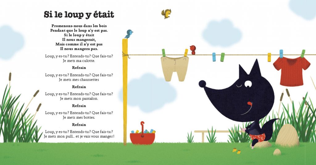 i le loup chantait livre cd, c’est dix chansons avec le grand méchant loup dedans. Ces comptines sont visibles sur la chaîne de comptines Youtube LA RECRE DES PTITS LOUPS.